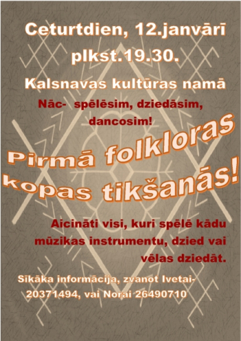 Latvija ir zeme ar senām folkloras tradīcijām, kas tiek koptas un turētas cieņā arī šodien. Tāpēc mēs kalsnavieši vēlamies, veidot pagastā folkloras kopu. Pirmā folkloras kopas tikšanās! Tiek aicināti visi, kuri spēlē kādu mūzikas instrumentu, dzied, vai vēlas dziedāt, visiem kam tuvas latviskās tradīcijas.