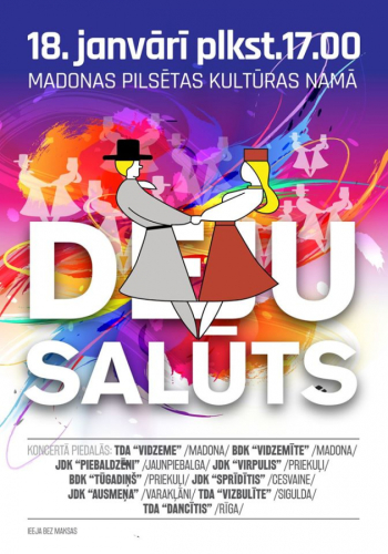 TDA “Vidzeme” aicina uz koncertu “Deju salūts” Madonas pilsētas kultūras namā, kurā pulcēsies draugi no dažādām Latvijas pusēm. Ar lustīgiem dančiem iegriezīsim jauno 2020.gadu, kas sola daudz jaunu pārbaudījumu, jo priekšā Latvijas skolu jaunatnes dziesmu un deju svētki.