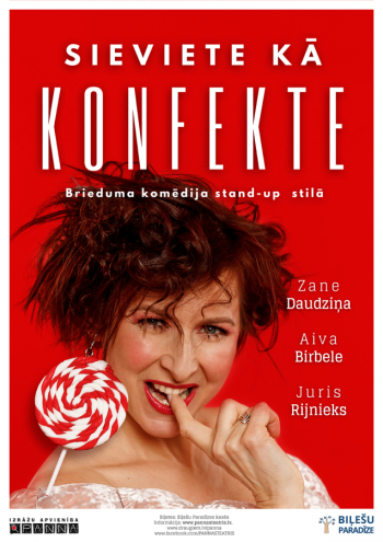 Jaunā komēdija ir likumsakarīgs turpinājums izrādei “Tāda es esmu”, kas kopā ar aktrisi Zani Daudziņu un režisoru Juri Rijnieku dzīvo uz Latvijas skatuvēm jau 10 gadus un apstiprina to, ko par sevi jāsaka katrai Latvijas sievietei: tāda es esmu – sieviete kā konfekte! Ko darīt, ja cienījamā vecumā esat nonākusi ne visai cienīgā situācijā? Ko darīt, ja gribas šokolādi, bet viss, ko dzīve piedāvā, ir izlauzt zobus pret ledenēm? Pannas Teātra jaunā izrāde “Sieviete kā konfekte” ir stāsts par sievieti, kura prot izgludināt saburzīto konfekšu papīrīti un padarīt sevi par gardumu, kuram nekad nebeidzas derīguma termiņš.