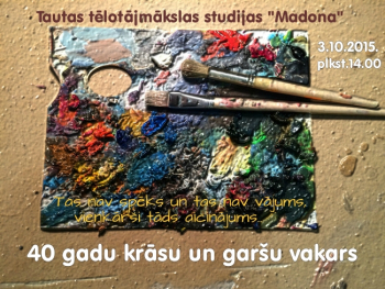 3.oktobrī pulksten 14.00 Tautas tēlotājmākslas studijas „Madona” aicina visus krāsu pasaules interesentus savus bijušos un esošos dalībniekus, atbalstītājus un vienkārši draugus padalīties krāsu sajūtās un uzpildīties ar jaunām gaišām emocijām „40 gadu garšu un krāsu vakarā”. Madonas kultūras nama telpās 1., 2. un 4. stāvā Studijas „Madona” izstādes. 4.stāvā, kurā studija mīt nu jau 8 gadus, būs iepazīšanās ar autoriem, būs iespēja iejusties mākslinieku pasaulē - mirkļi mūzikā, fotokrāsās un sarunās, piedalīšanās uzstādījumu salikšanā, Gleznošanas darbnīcās un Fotosalonā. Gaidīs arī jubilejas kūka un citas garšas. Cik garš ievilksies vakars, būs pašu rokās!