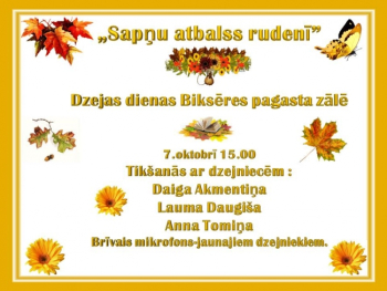Pasākumā ar savu radošo veikumu iepazīstinās vietējās dzejnieces - Daiga Akmentiņa, Lauma Daugiša un Anna Tomiņa. Brīvais mikrofons jaunajiem dzejniekiem...