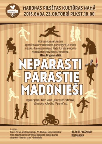 Šogad, Madonas 90 jubilejas gadā, vēlamies aizsākt ikgadēju jaunu pasākumu “Neparasti parastie madonieši”. Sarīkojuma laikā iepazīsimies ar cilvēkiem, kuri kādā veidā ir saistīti ar Madonu. Kāds šeit ir mācījies, cits dzimis, strādā vai dzīvo. Bet, galvenais - katram no uzaicinātajiem dalībniekiem ir kāda interesanta aizraušanās, hobijs vai citāda dzīves uztvere ārpus ikdienas ritma, kas savā veidā jau ir neparasti, jo tas nav nemaz tik vienkārši atrast un piepildīt savus sapņus un intereses. Tam ir nepieciešama liela apņēmība, cīņas un nemiera gars...