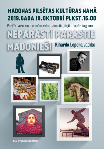 Jau ceturto gadu Madonas pilsētas kultūras namā aicinām iepazīt līdzcilvēkus, kas strādā, darbojas un savā aizrautībā, dzīves uztverē vai kā citādi mums šķiet dzīves bagāti ar savu redzējumu uz lietām, kas notiek mums apkārt. Pasākumā "Neparasti parastie madonieši" būs dziesmas, dejas - mūsdienu deju grupa “Aliens”, kustība, pārsteigumi, videosižeti (Kārlis Kumsārs) un dažādi notikumi, sarunas un atklājumi. Par pasākuma kopīgo atmosfēru rūpēsies Rihards Lepers.