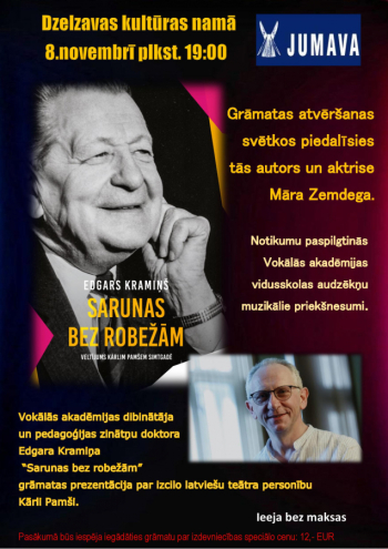 Vokālās akadēmijas dibinātāja, pedagoģijas zinātņu doktora Edgara Kramiņa “Sarunas bez robežām” grāmatas prezentācija par izcilo latviešu teātra personību Kārli Pamši. Grāmatas atvēršanas svētkos piedalīsies pats grāmatas autors Edgars Kramiņš, aktrise Māra Zemdega un pasākumu paspilgtinās Vokālās akadēmijas vidusskolas audzēkņu muzikālie priekšnesumi.
