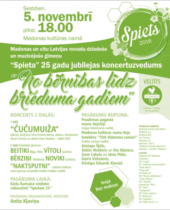 Ir atkal novembra sākums, kad dziedošo-muzicējošo ģimeņu “Spiets” dodas pie saviem klausītājiem un skatītājiem, šoreiz gan 25 gadu jubilejas zīmē, veltot šos svētkus arī savai Madonai 90. gadadienā. Pilsētā, kur esi gaidīts, uz “Spieta” jubilejas pasākumu ieradīsies gan savējie, gan viesi...