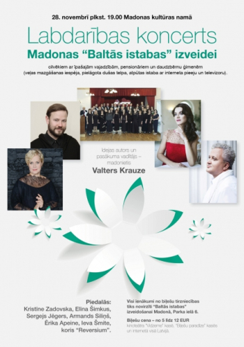 28.novembrī plkst.19.00 Madonas kultūras namā notiks burvīgs Latvijas operas solistu populārās pasaules opermūzikas labdarība koncerts solistu Kristīnes Zadovskas, Elīnas Šimkus, Sergeja Jēgera, Armanda Siliņa, koncertmeistaru Ērikas Apeines, Ievas Šmites un kora "Reversium", kurā pēc madonieša, aktiera un populāro televīzijas šovu vadītāja Valtera Krauzes un domu draugu iniciatīvas tiks vākti naudas līdzekļi Madonas "Baltās istabas" izveidei Parka ielā 6...