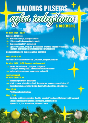 Aicinām iededzināt Madonas pilsētas egli, piedalīties dažādās svētku gatavošanas norisēs pilsētā, kuru galvenā tēma būs zvaigznes simbols - Zvaigznīte kā eglītes rota, kā sniegpārsliņa vai arī pats vari kļūt par zvaigzni...