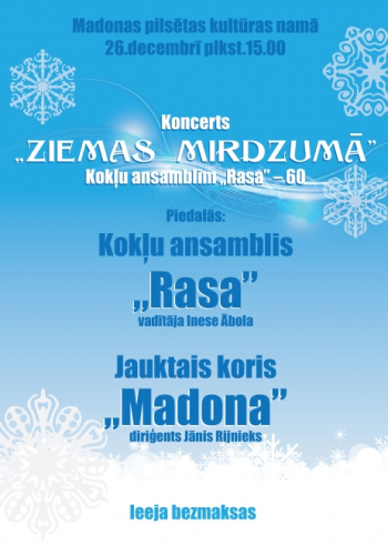 Ziemassvētki ir laiks, kad visapkārt jūtama īpaša atmosfēra. Tumšajā un aukstajā decembra laikā ziemas pēcpusdienā aicinām klausītājus uz kokļu mūzikas un kora dziesmu koncertu ar miera, prieka un cerību caurstrāvotām melodijām Ziemassvētku noskaņās. Latviešu tautasdziesmas, kā arī tradicionālas Adventa dziesmas un mūsdienīgas Ziemassvētku kompozīcijas izskanēs koncertā kora „Madona” (diriģents Jānis Rijnieks) un kokļu ansambļa „Rasa” izpildījumā (vadītāja Inese Ābola)...