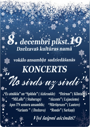 8.decembrī Dzelzavas kultūras namā uz kopīgu sadziedāšanos koncertā „No sirds uz sirdi” tiksies 10 vokālie ansambļi no Madonas, Gulbenes, Aizkraukles, Jaunjelgavas, Pļaviņu un Apes novadiem. Koncerts būs skanīgs un daudzveidīgs, jo katrs kolektīvs ir īpašs, katram ir savs repertuārs, savs skanējums un savs priekšnesuma pasniegšanas vieds. Aicināti visi interesenti!