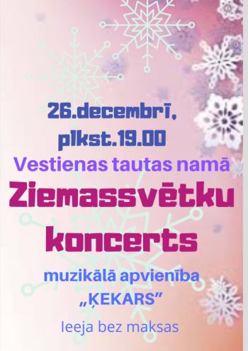 Muzikālā apvienība "Ķekars" aicina vestieniešus uz koncertu Ziemassvētku noskaņās. Ziemassvētkos tumsa uzvar gaismu un ideāli stāv pāri sadzīves niekiem. Ziemassvētkos piedzima Jēzus - cilvēks, kurš neatgriezeniski mainīja pasauli. Arī mākslinieku misija ir iedvesmot cilvēkus. Vistiešākajā veidā to dara mūzika…