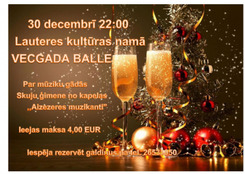 Pavadīsim Veco gadu radu un draugu pulkā kopā ar Skuju ģimeni no grupas "Aizezeres muzikanti". Omulībai līdzi ņemt "groziņu". Galdiņus lūdzam rezervēt pa tālruni: 26531050.