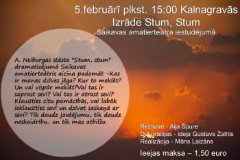 A.Neiburgas stāsta "Stum, stum" dramatizējumā Saikavas amatierteātris aicina padomāt - Kas ir manas dzīves jēga? Kur to meklēt? Un vai vispār meklēt? Vai tas ir saprast sevi? Vai tas ir atrast sevi? Klausīties citu pamācībās, vai labāk ieklausīties sevī un dzīvot saskaņā ar sevi? Tik daudz jautājumu, tik daudz neskaidrību.. un tik maz atbilžu...