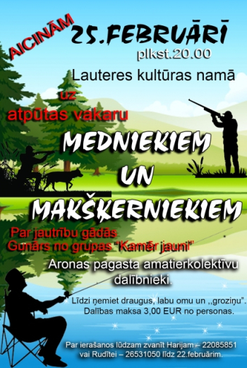 Visi, kam vaļasprieks ir makšķerēšana un medības, laipni aicināti uz Lauteres kultūras namu, kur notiks viņiem veltīts atpūtas vakars ar jautrām dejām, konkursiem un atrakcijām. Par labsajūtu gādās Gunārs no grupas ,,Kamēr jauni” un Aronas pagasta pašdarbības kolektīvi.