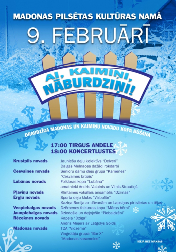 Es savam kaimiņam/ Mūžam slikta nevēlēju:/ Pie kaimiņa sāls sauja,/ Pie kaimiņa uguntiņa. Kādreiz kaimiņu mājas atradās tikai sauciena attālumā, nāburgi izmantoja vienu ceļu, robežas starp īpašumiem iezīmēja vien kādi stādījumi, pie kaimiņa skrēja pēc palīdzības, kas pie reizes izpildīja psihologa funkcijas. Šodienas žogu tirdzniecība ieviesusi kārtīgas korekcijas kaimiņu attiecībās. Tāpēc 9.februārī Madonas novads aicina ciemos uz draudzīgu kaimiņu novadu kopā būšanu "Ai, kaimiņi, nāburdziņi" Madonas kultūras namā, lai satiktos un iepazītos, lai kopīgi dejotu un tirgotos, lai atskanētu dziesma un iepazītu viens otru vairāk, lai parunātu un uzzinātu.