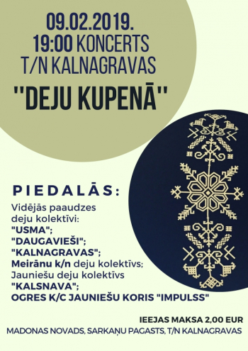 Uz koncertu “Deju kupenā” aicina vidējās paaudzes deju kolektīvs “Kalnagravas”. Kopā ar viņiem, īsti ziemīgās noskaņās, koncertā piedalīsies vidējās paaudzes deju kolektīvi “Usma” (Ventspils novads), “Daugavieši” (Līvānu novads), Meirānu tautas nama vidējās paaudzes deju kolektīvs (Lubānas novads), jauniešu deju kolektīvs “Kalsnava” un Ogres Kultūras centra jauniešu koris “Impulss”.