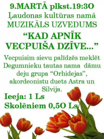 9. martā plkst. 19:30 dāmas un kungi aicināti uz muzikālu uzvedumu "Kad apnīk vecpuiša dzīve.."