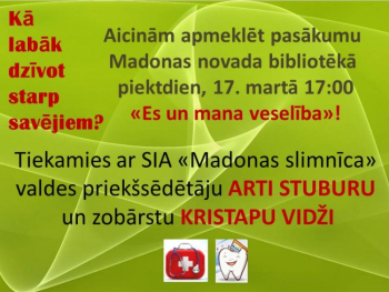 Madonas novada bibliotēkas apmeklētājiem šogad piedāvāsim pasākumu ciklu: ”Kā labāk dzīvot starp savējiem?”, piesaistot Madonas novada nozaru speciālistus. 17.martā plkst.17:00 aicinām visus interesentus uz pirmo sarunu bibliotēkā “Es un mana veselība”. Ar interesentiem piekrituši tikties SIA “Madonas slimnīca” valdes priekšsēdētājs Artis Stuburs un zobārsts Kristaps Vidžis. Daži no sarunu pieturas punktie