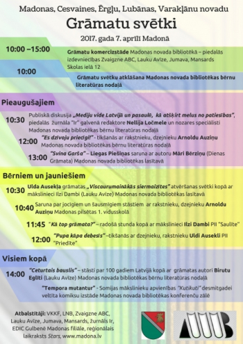7.aprīlī Madonas novada bibliotēkā tiks svinēti Grāmatu svētki. Pasākuma ietvaros paredzētas tikšanās ar talantīgiem rakstniekiem, dzejniekiem, māksliniekiem un mediju nozares speciālistiem.