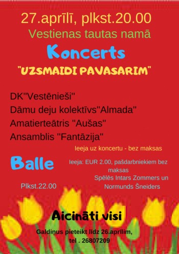 Lai kliedētu ziemas drūmumu un uzņemtu jaunus spēkus pirms lielajiem pavasara darbiem ,sanāksim kopā un svinēsim no sirds. Koncertā piedalīsies Vestienas pašdarbības kolektīvi ar lustīgiem priekšnesumiem, pēc koncerta - balle ar Intaru Zommeru un Normundu Šnēdiņu.