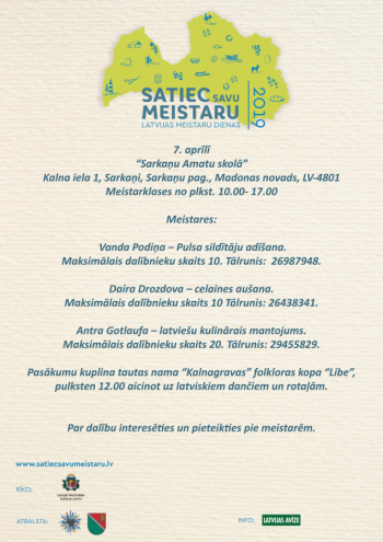 2019.gadā jau 11 reizi dažādu prasmju meistari 155 norises vietās Latvijā gaidīs savus apmeklētājus projekta "Satiec savu meistaru!" ietvaros. Arī šogad meistari interesentus iepazīstinās ar aušanas, adīšanas, tamborēšanas, izšūšanas prasmēm, kokamatniecību, keramiku, dažādiem mūzikas instrumentiem, latviskām dziesmām un dančiem, un vēl daudz citām interesantām lietām. Iepazīt amatu prasmes interesenti tiek aicināti arī “Sarkaņu Amatu skolu”. Svētdien, 7.aprīlī ikviens tiek aicināts apgūt jaunas zināšanas un prasmes profesionālu meistaru vadībā.