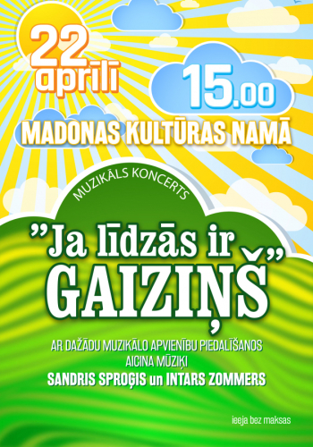 Madonas mūziķi Sandris Sproģis un Intars Zommers aicina uz muzikālu koncertu “Ja līdzās ir Gaiziņš”. Koncerta nosaukums izsaka daudz. Pieturēsim pie Gaiziņa apkārtnē dzimušo, dzīvojušo un mītošo komponistu un dzejdaru literāri muzikālās daiļrades. Mēs neapzināmies vai vienkārši nezinām, ka tik daudzas Latvijā populāras un plaši atpazīstamas dziesmas radījuši mūsu cilvēki. Dažas no tām dzirdēsim koncertā. Kā arī dosim iespēju sevi parādīt jaunajiem dziesmu autoriem un mūziķiem.