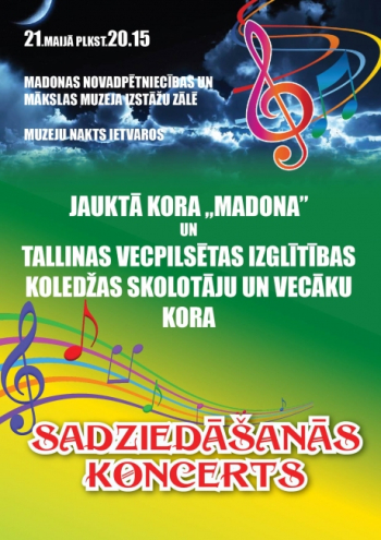 Aicinām piedalīties jauktā kora “Madona” un Tallinas vecpilsētas Izglītības koledžas skolotāju un vecāku kora sadziedāšanās koncertā. Koncertā tiekamies Madonas novadpētniecības un mākslas muzeja Izstāžu zālēs 21.maijā pulksten 20.15. Vairāk par Muzeju nakts aktivitātēm Madonā variet izlasīt turpinājumā: