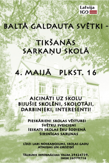 Festivāla “Svinam Latvijas simtgadi Latvija novados” Goda aplis 4.maijā iegriežas Sarkaņos, kur pulksten 16 sāksies Baltā galdauta svētki “Skolas stāsts - raksts Latvijas vēstures audeklā”, uz kuriem aicinām bijušās Sarkaņu skolas skolēnus un skolotājus, darbiniekus un visus interesentus!