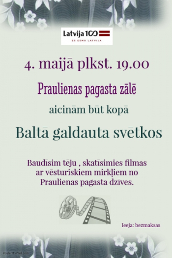 Aicinām būt kopā Baltā galdauta svētkos Praulienas pagasta zālē. Pie mūsu Baltā galdauta skatīsimies video filmas un fragmentus par vēsturiskiem mirkļiem no Praulienas pagasta dzīves, baudīsim tēju un vienosimies kopīgā dziesmā kopā ar Normundu Šneideri.