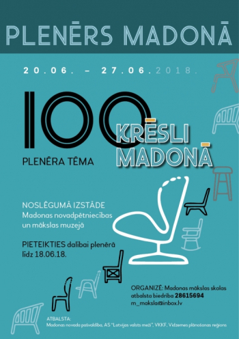 Madonas mākslas skolas atbalsta biedrība aicina visus interesentus iesaistīties plenēra aktivitātēs no 20. līdz 27.jūnijam. Šogad ar Madonas novada pašvaldības, VKKF atbalstītās “Vidzemes kultūras programmas 2018” un A/S Latvijas valsts meži finansiālu atbalstu, glezniecības plenērs tiek organizēts Madonas pilsētā. Plenēra noslēgumā paredzēts izveidot izstādi Madonas novadpētniecības un mākslas muzeja Izstāžu zālēs.