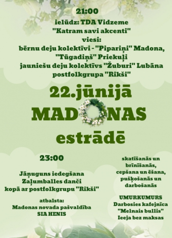 Pulksten 12:00 Madonas pilsētas kultūras namā muzikāls veltījums Jāņa Norviļa Madonas mūzikas skolas audzēkņu, absolventu un pedagogu akordeonistu ansambļa izpildījumā (vadītāja Silvija Bērziņa). Turpinājumā dokumentālā filma "Lidija" (režisors Andrejs Verhoustinskis). Filmā caur Lidijas mūžu parādīts visas Latvijas tautas ceļš. Cilvēka seja, viņa acis glabā pieredzi labāk nekā jebkurš dokuments vai pierakstīts atmiņu stāstījums. Īpaši, ja šis cilvēks ir tik daudz piedzīvojis kā Lidija Lasmane-Doroņina...