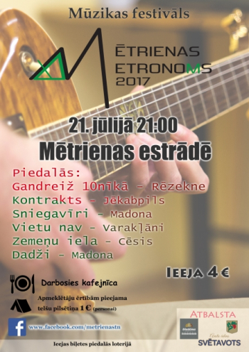 Mētrienas tautas nams aicina uz dančiem, atjaunotajā Mētrienas estrādē, visas nakts garumā. Jūs priecēs un dejā pavadīs 6 mūziķu apvienības, kuras spēlēs gan visiem jau labi zināmos šlāgerus, gan dzirdēsim kaut ko roķīgāku...