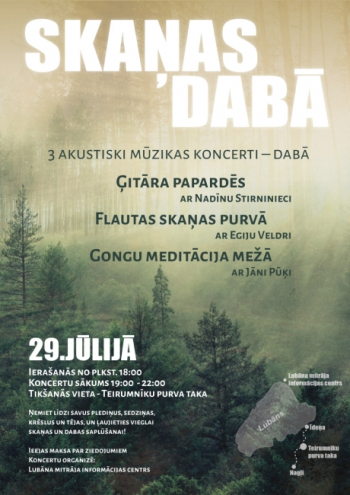 Aicinām Jūs uz vēl nebijušu pasākumu Lubāna mitrāja informācijas centra darbības laikā - Skaņām dabā! Trīs akustiskās mūzikas koncerti 29.jūlijā, kuru norises vieta ir dabā, visā savā krāšņumā - leknā zaļumā papardēs, svētlaimīgā mierā purvā un majestātiskās priedēs! Katrai vietai savs mūzikas instruments, savs mākslinieks, kas ar mūzikas palīdzību caurvīs dabu un cilvēku, ļaujot tiem saplūst vien sev zināmā skanējumā... Par pasākuma norises vietu ir izvēlēta teritorija ap Teirumnīku purva taku, kas atrodas dabas liegumā „Lubāna mitrājs”, Rēzeknes novada, Nagļu pagastā. Šī vieta nav izvēlēta nejauši - tā salīdzinoši nelielā teritorijā mums spēj dāvāt tik daudz skaistā!