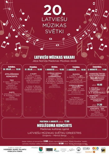 Latviešu mūzikas vakari Jāņa Norviļa Madonas Mūzikas skolā no 30.jūlija līdz 3.augustam un 4.augustā Madonas pilsētas kultūras namā Latviešu mūzikas svētku orķestra koncerts: