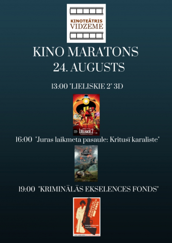 Lai piedāvātu iespēju noskatīties aktuālāko 2018.gada pirmās puses filmu klāstu un atgūtu nokavēto, no 22.augusta līdz 30.augustam kinoteātrī “Vidzeme” tiek organizēts “Kino maratons”, kura laikā katru dienu būs iespējams vērot trīs dažādas filmas gan bērniem gan pieaugušajiem.