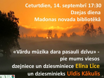 Laipni aicinām uz Dzejas dienu pasākumu „Vārdu mūzika dara pasauli dzīvu” - pie mums viesos dzejniece un mūziķe Elīna Līce un dziesminieks Uldis Kākulis. Lai pasaule atdzīvotos mūsos gaismā un stiprumā, nepieciešama gan sava daļa sievišķības, gan vīrišķā spēka. Aicinām ieklausīties Elīnas un Ulda vārdu mūzikā.