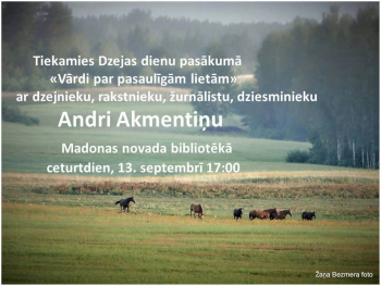 Ielūdzam uz Dzejas dienu pasākumu “Vārdi par pasaulīgām lietām”. Šoreiz tā būs tikšanās ar dzejnieku, rakstnieku, žurnālistu, dziesminieku Andri Akmentiņu. A.Akmentiņš dzimis Valmierā, dzeju publicē kopš 1988.gada, rakstījis tekstus dziesmām, ir vairāku dzejas grāmatu un stāstu krājumu autors, 1991.gadā ieguvis Klāva Elsberga literāro prēmiju.