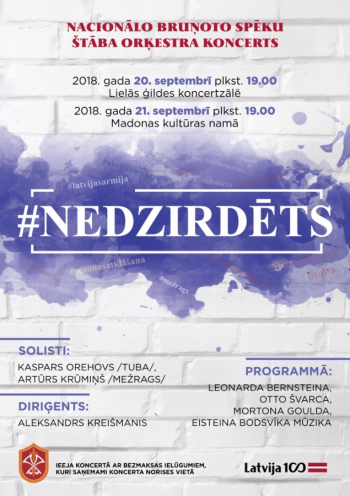 Ar diviem vērienīgiem koncertiem - šā gada 20.septembrī pulksten 19:00 Lielās ģildes koncertzālē Rīgā un 21.septembrī pulksten 19:00 Madonas kultūras namā 2018./19.gada koncertsezonu uzsāks Nacionālo bruņoto spēku štāba orķestris. Sezonas atklāšanas koncertprogrammā “#nedzirdēts” vienkopus apvienoti līdz šim neatskaņoti skaņdarbi, kas domāti šodienas klausītājam.