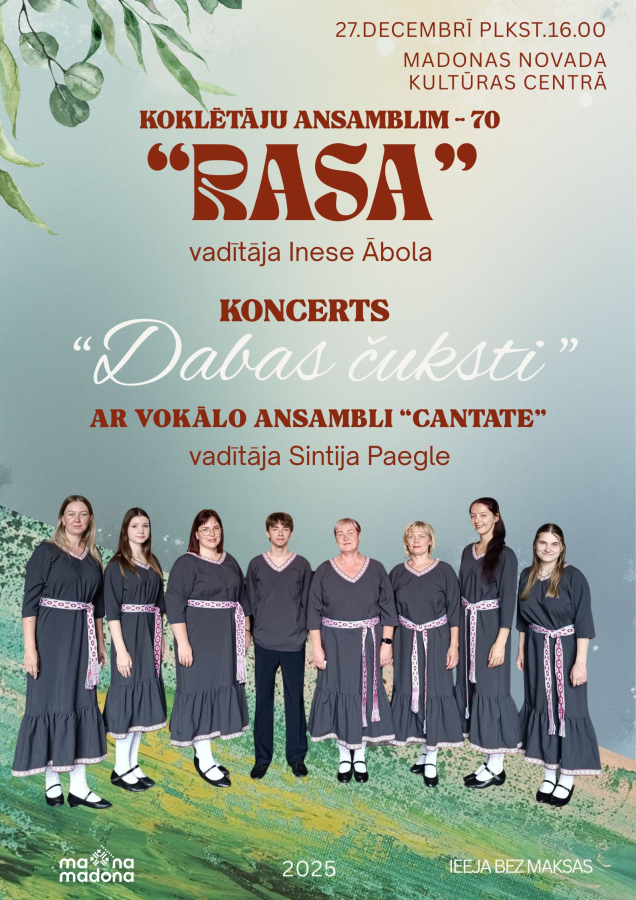 Koncertu kuplinās Madonas novada kultūras centra vokālais ansamblis "Cantate" Sintijas Paegles vadībā.
