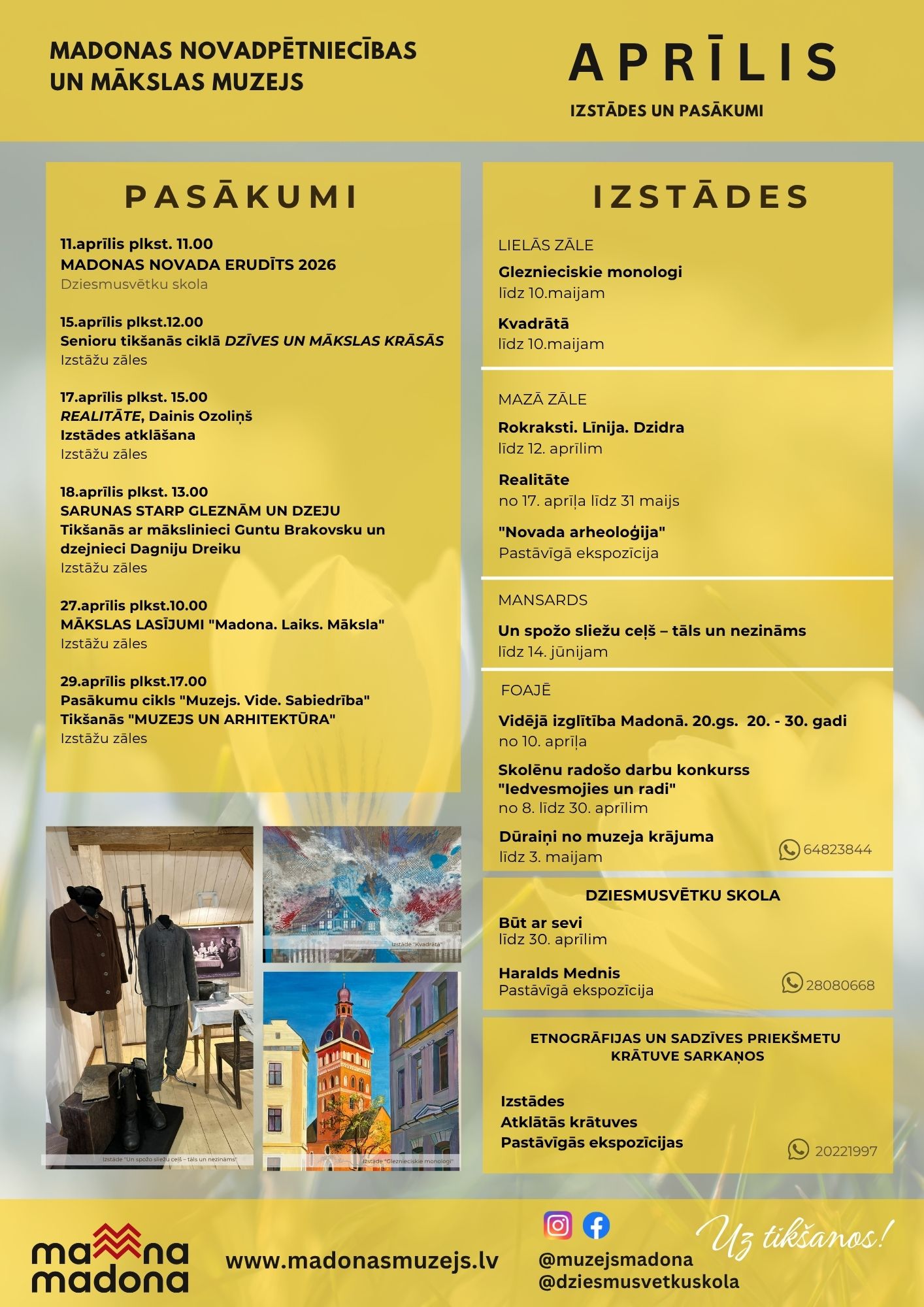 Visa mēneša garumā aicinām apmeklēt daudzveidīgas izstādes – no glezniecības un grafikas līdz vēstures likteņstāstiem par mūsu Madonas novadu. Iepazīsti mākslinieku darbus, sajūti dažādu laikmetu noskaņu!