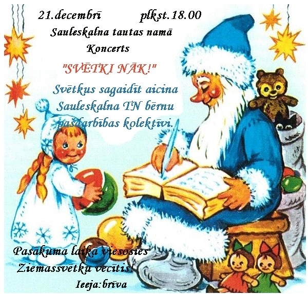 21.decembrī plkst.18.00 Sauleskalna tautas namā Koncerts "Svētki nāk!" Piedalās Sauleskalna tautas nama bērnu pašdarbības kolektīvi.