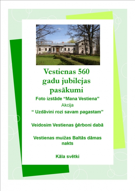 Šogad Vestiena atzīmēs 560 gadu jubileju, par godu kurai, mēs jau esam atvēruši fotoizstādi Vestienas mājas lapā un mūsu Tautas namā. Šajā gadā esam iecerējuši godināt Vestienu ar jauniem rožu stādījumiem pagasta centrā, un izveidotu Vestienas ģerboni līdzās Pagastmājai. Ipašā naktī muižas Baltā dāma iepazīstinās ar Vestienas noslēpumiem, bet jūnija vakarā sadziedāsimies pār Kāla ezera ūdeņiem