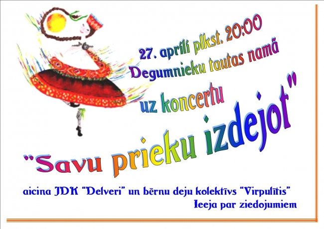 .aprīlī plkst.20:00 uz koncertu " Savu prieku izdejot " aicina JDK " Delveri " un bērnu deju kolektīvs " 'Virpulītis" Plkst.22:30 balle.Spēlēs Zintis Krakops.