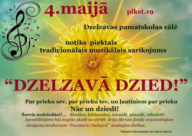 Ar savām brīvi izvēlētām dziesmām priecēs dažādu paaudžu dzelzavieši. Būs iespēja skatīt un vērtēt Ārija Skrides fonda organizētajam zīmējumu konkursam iesniegtos darbus.Visi laipni aicināti!
