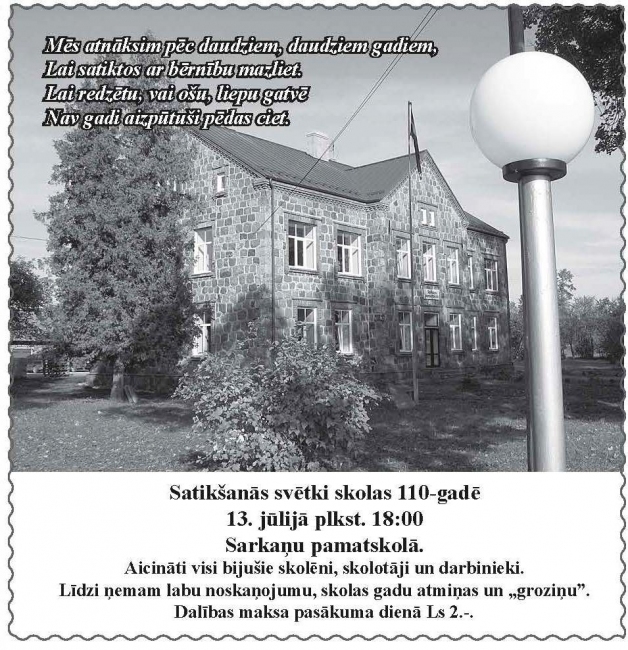 13. jūlijā plkst. 18:00 Sarkaņu pamatskolā