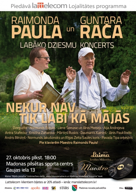 Paula un Rača populārākos kopdarbus koncertā 27.oktobrī plkst. 18:00 Madonas pilsētas sporta centrā dziedās Dzeguzīte, Normunds Rutulis, Antra Stafecka, Mārtiņš Ruskis, Liene Šomase un Jānis Moisejs, Normunds Jakušonoks un Rīgas Zelta Saules koris, Aija Andrejeva, Kristīna Zaharova, kā arī aktieri Andris Bērziņš un Jānis Paukštello. Pirmo reizi Madonā izskanēs dziesmas „Spītība” un „Ceļš uz mājām” Daumanta Kalniņa izpildījumā.