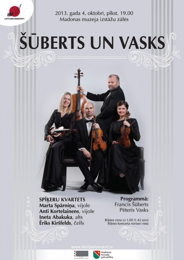 Spīķeru kvartets, tā pirmās vijoles Martas Spārniņas dzimtajā pilsētā, viesosies ar koncertprogrammu “Šūberts un Vasks”. Spīķeru kvartets ir savienība mūzikā, tas neierasti saticīgi un radoši kopā muzicē kopš 2011. gada. Kvartetā spēlē orķestra Sinfonietta Rīga koncertmeistare Marta Spārniņa, viņas vietnieks Anti Kortelainens, orķestra altu grupas mūziķe Ineta Abakuka un Liepājas Simfoniskā orķestra čellu grupas koncertmeistars Ēriks Kiršfelds. Kvarteta nosaukums patapināts no tā galvenās mītnes – Spīķeru koncertzāles. Kvarteta repertuārs ir daudzveidīgs un aptver laika posmu no Vīnes klasikaspērlēm līdz mūsdienu partitūrām. Īpašu vietu repertuārā ieņem latviešu komponistu stīgu kvarteti un to popularizēšana visos veidos. Šajā koncertprogrammā kvartets ir iekļāvis pasaulē visplašāk atpazīstamā latviešu komponista Pētera Vaska Piekto stīgu kvartetu, par kuru pats komponists ir izteicies, ka šajā kompozīcijā vēlas pavēstīt, ka mēs visi esam daļa no pasaules un pasaule ir mūsos, par ideālisma pastāvēšanu un nepieciešamību, par mīlestību mums apkārt un mūsos. Līdzās Pētera Vaska kvartetam, koncertprogrammā iekļauts austriešu komponista Franča Šūberta 1824. gada martā sacerētais kvartets, kas nosaukumu ieguvis no Šūberta sacerētās dziesmas “Nāve un meitene”, jo tās motīvs izmantots kvarteta otrajā daļā. Lai nebiedē kvarteta nosaukums “meitenes un nāves” motīvs ir izplatīts vācu literatūrā un mūzikā kopš renesanses laikiem, un šī skaņdarba kontekstā nāvi var traktēt, kā meitenes mīļoto.