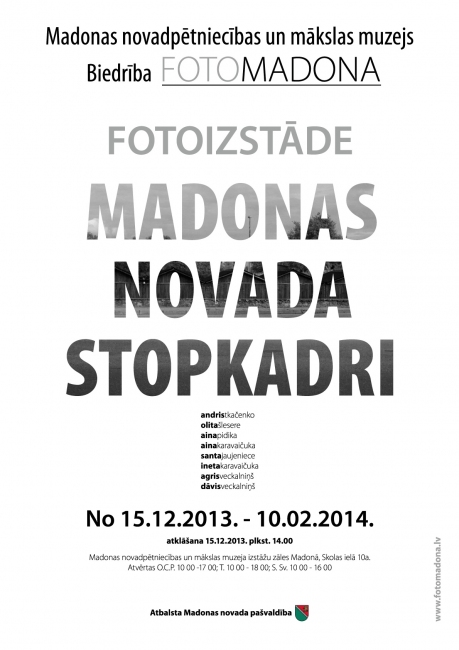 Madonas novadpētniecības un mākslas muzeja izstāžu zālēs 15. decembrī pulksten 14.00 tiks atklāta biedrības „FOTO MADONA” izstāde „Madonas novada stopkadri”.