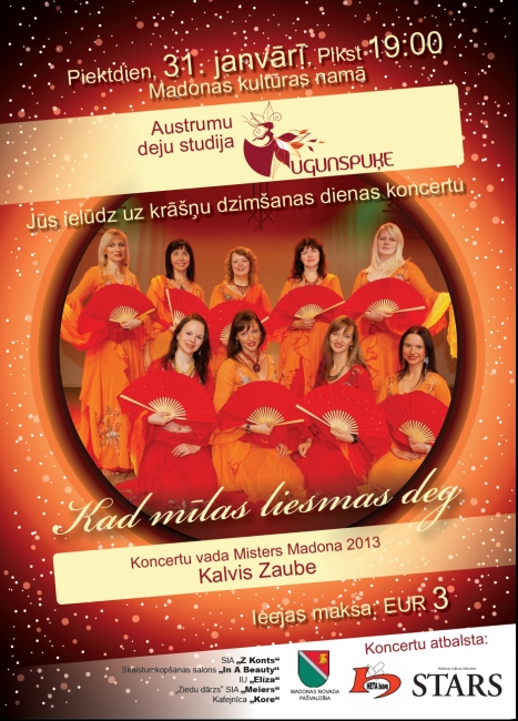 31. janvārī plkst. 19.00 Madonas kultūras namā Austrumu deju studija „Ugunspuķe“ dejotājas savus radus, draugus, kolēģus un vienkārši dejas mīļotājus ielūdz uz krāšņu dzimšanas dienas koncertu „Kad mīlas liesmas deg“, kas būs veltījums „Ugunspuķes“ piedzimšanai. Koncerts lauzīs priekšstatu par klasisku austumu deju atspoguļojumu, priekšnesumi tiks papildināti ar atjautīgiem videosižetiem par precību tēmu. Koncerta stāsts mīsies ar dažādām tradicionālām un mūsdienīgākām austrumu dejām.