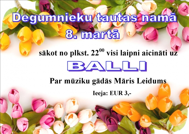 Ieejas maksa: 3.00 €.Informāciju iesūtīja: Ošupes pagasta Degumnieku tautas nama vadītāja Ilze Melngaile.Mob.tālr.: 00 371 25622223 Ievietoja:Inga ArājaIevietots: 25.02.2014.Rediģēts: 26.02.2014.