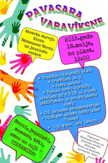 Bērzaunes pagasta Bērnu un jauniešu centrā 16.maijā no pulksten 12.Ieeja: bez maksas.